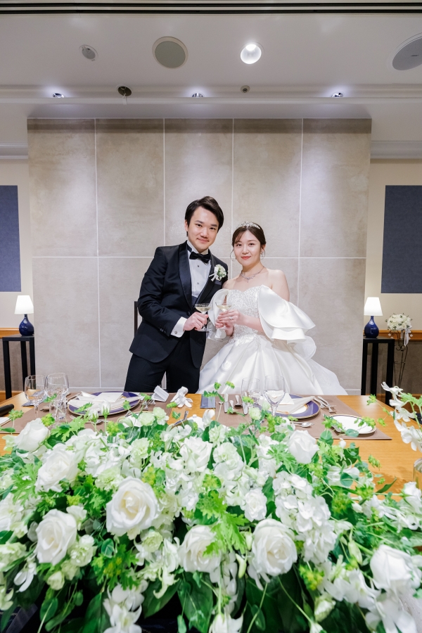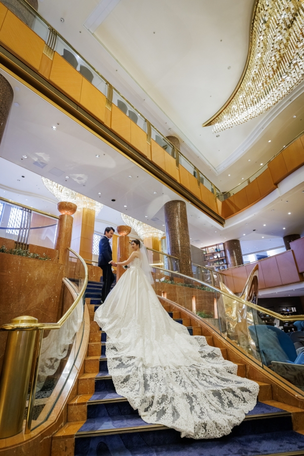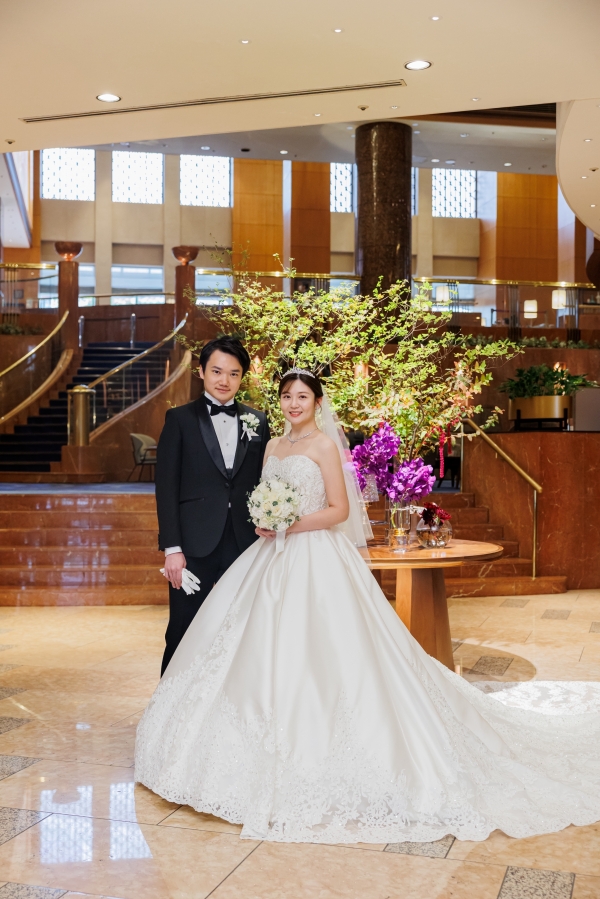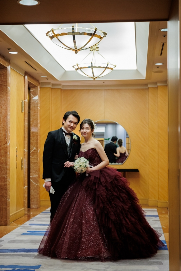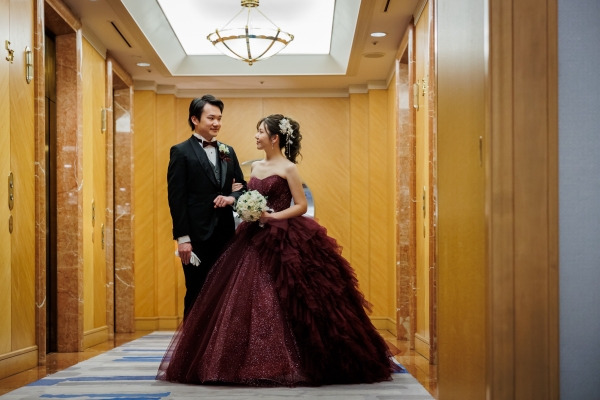 ホテルに映えるロングトレーンドレスとワインカラーのカクテルドレスを美しく着こなしていただき、ブラックタキシードのスタイリッシュなご新郎様と共に見惚れております。