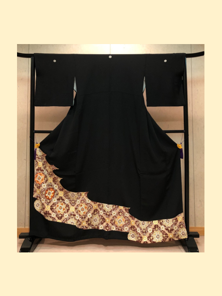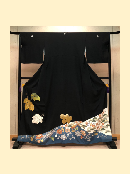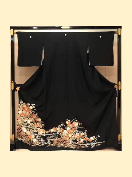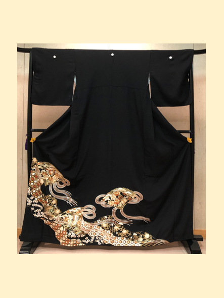 結婚式の参列衣装に相応しい吉祥文様があしらわれた正絹の黒留袖は、高級感と肌触りの良さを兼ねております。