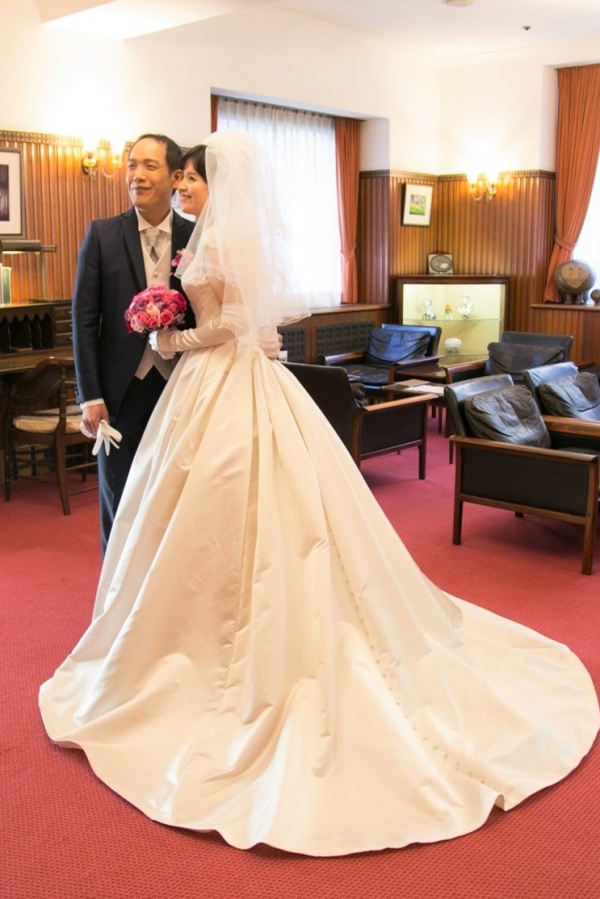 この度のご婚儀、誠におめでとうございます。瀟洒なホテルでの素敵な2ショットの数々、誠にありがとうございます。とてもお似合いで、大好評とのことで嬉しいです。これからも仲睦まじくお過ごしくださいませ。N様M様のご清栄を心よりお祈り申し上げます。 株式会社 東衣装店