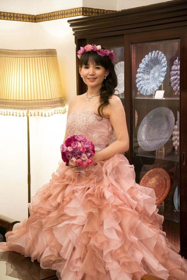 カラードレスは一目で気に入りすぐに決まりました。大好きなピンクのドレスをたくさん試着し、
