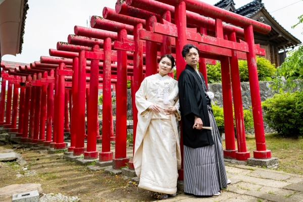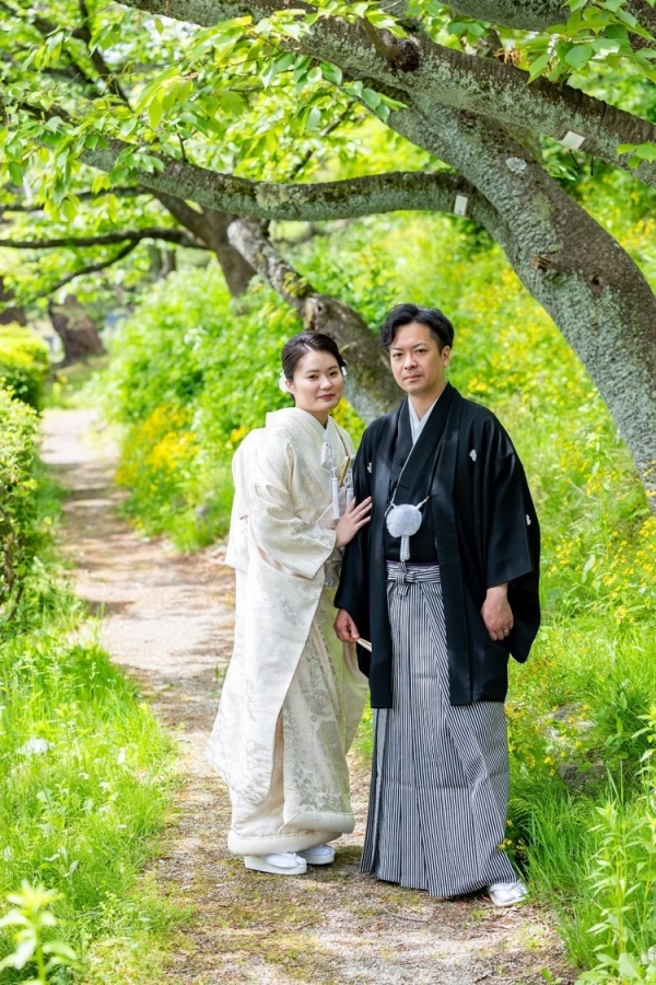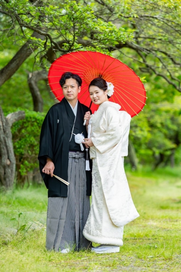 清楚な白無垢と凛々しい紋服での仲睦まじいお姿に見惚れおります。