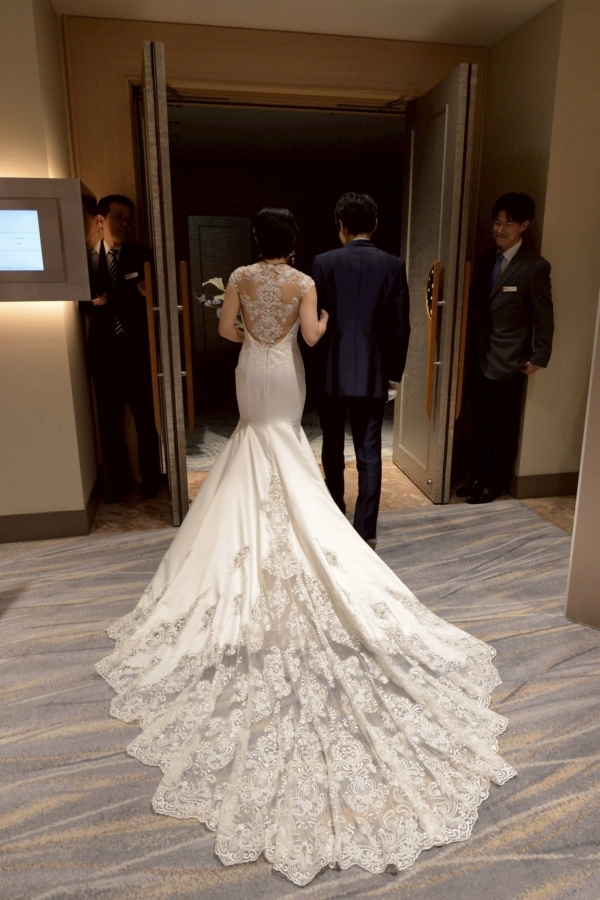 レースのマーメイドドレスとシンプルなカクテルドレスがとてもお似合いのご新婦様と、スタイリッシュなタキシード姿のご新婦様との幸せなショットに見惚れております。