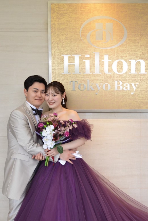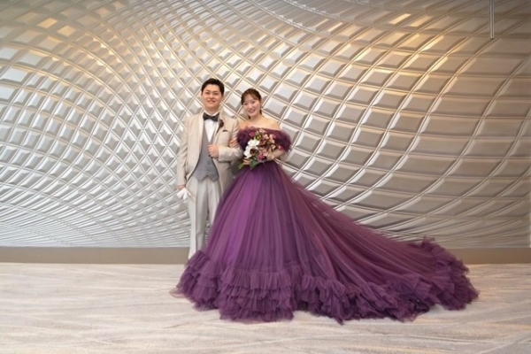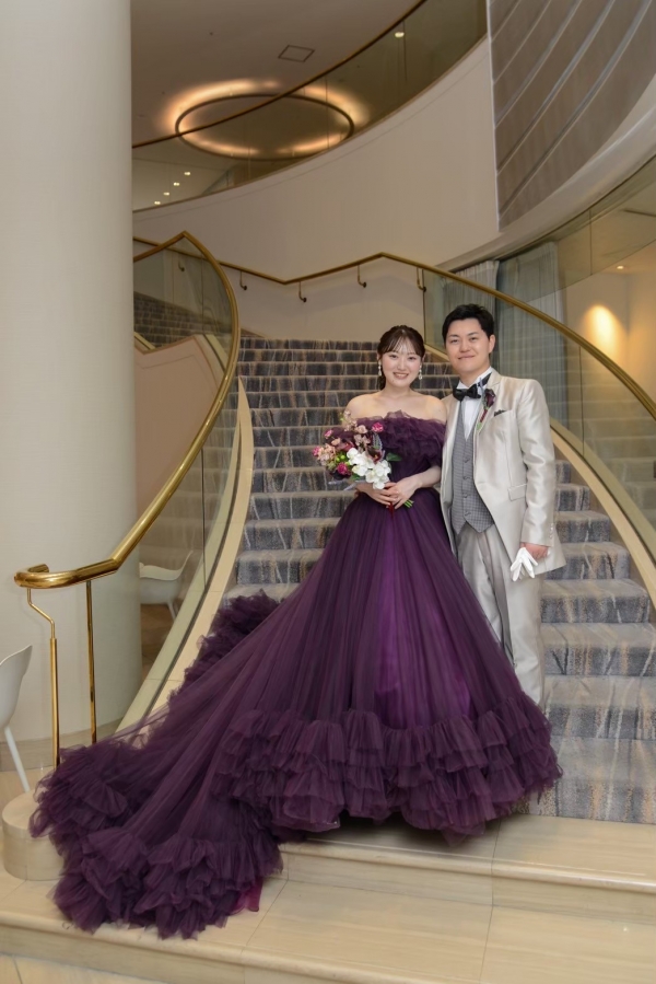 輝きのあるウェディングドレスとリュクスなパープルドレスを美しく着こなしていただき
