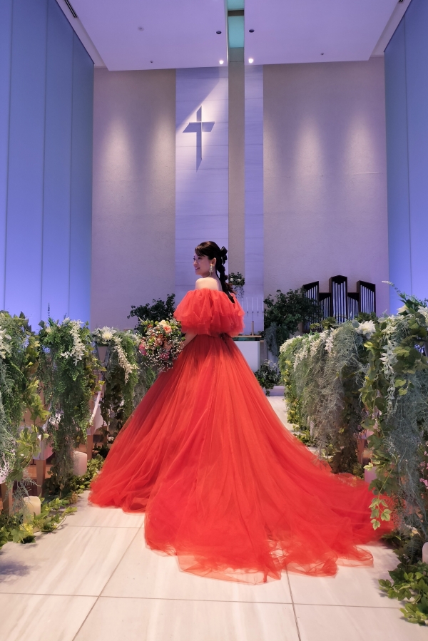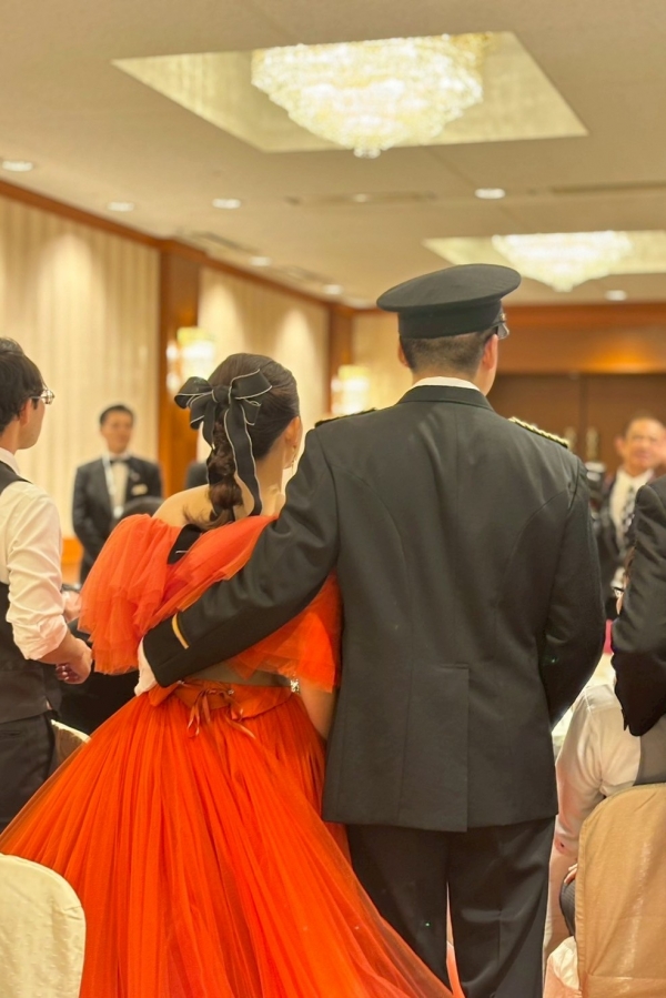 幻想的なチャペルに映えるオレンジのカラードレスをとても素敵に着こなしていただいて、凛々しい礼服姿の