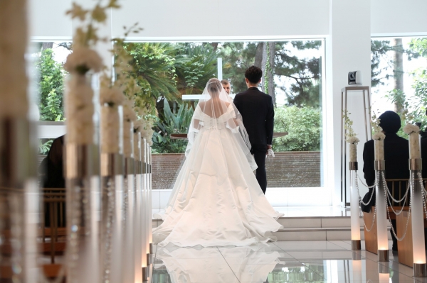優しい滑らかなサテンのドレスがご新婦様の雰囲気にとても合っていらっしゃいますね。