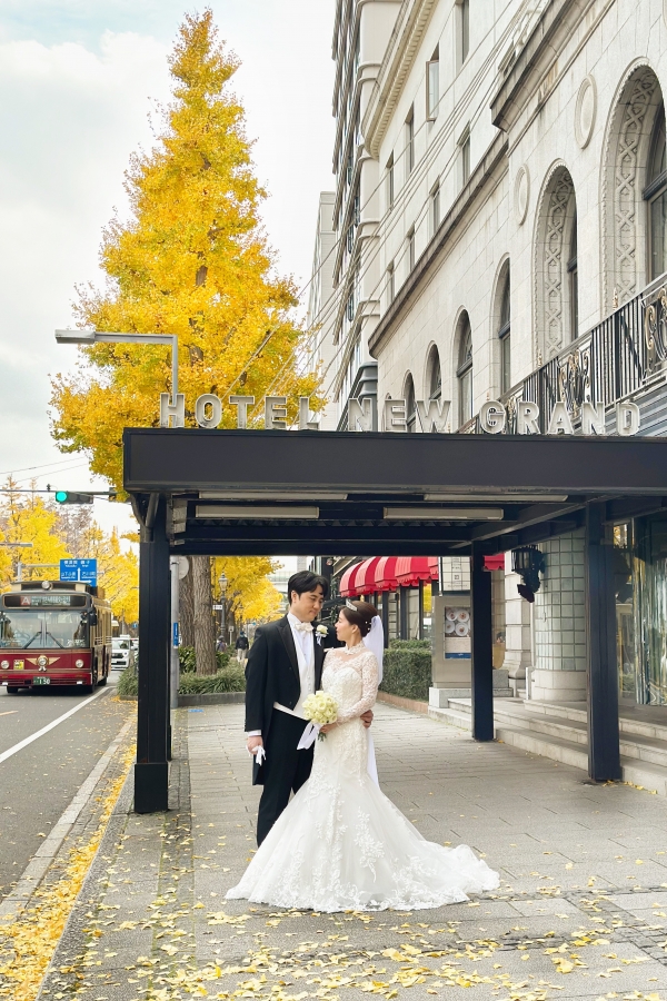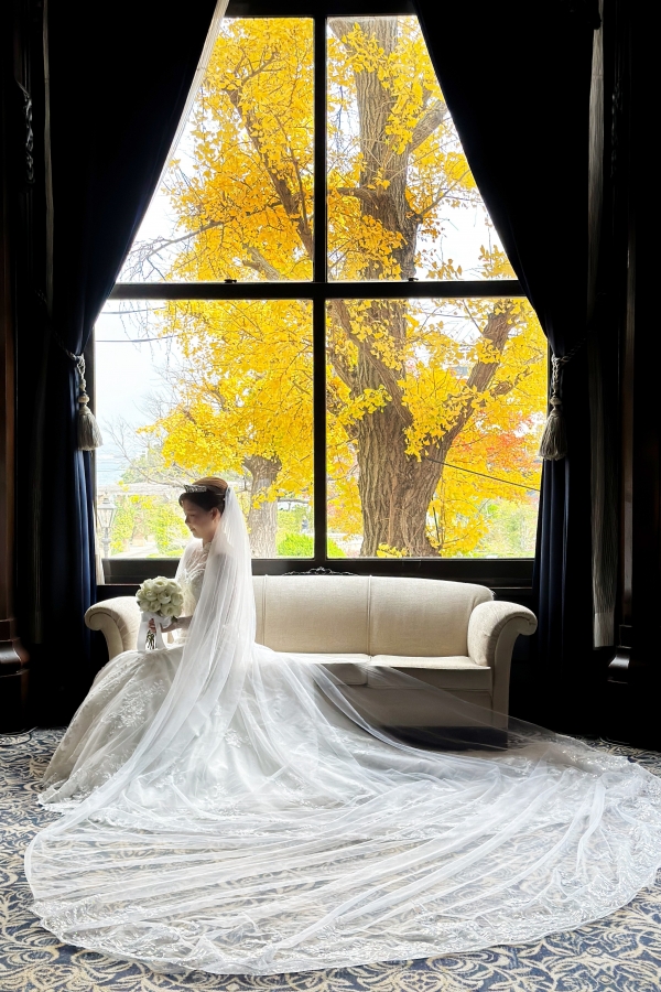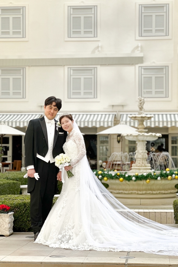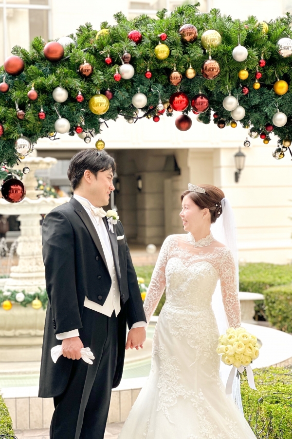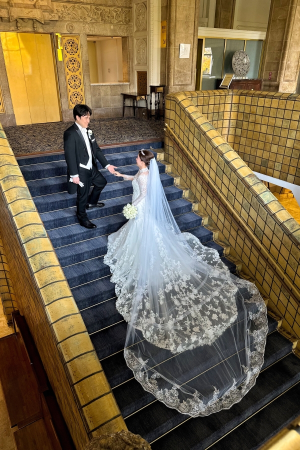 象徴的な階段や素敵なロケーションで、ロングトレーンドレスと燕尾服をとても美しくお召しいただき見惚れております。