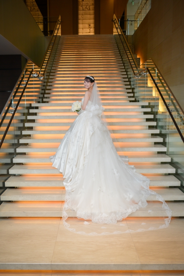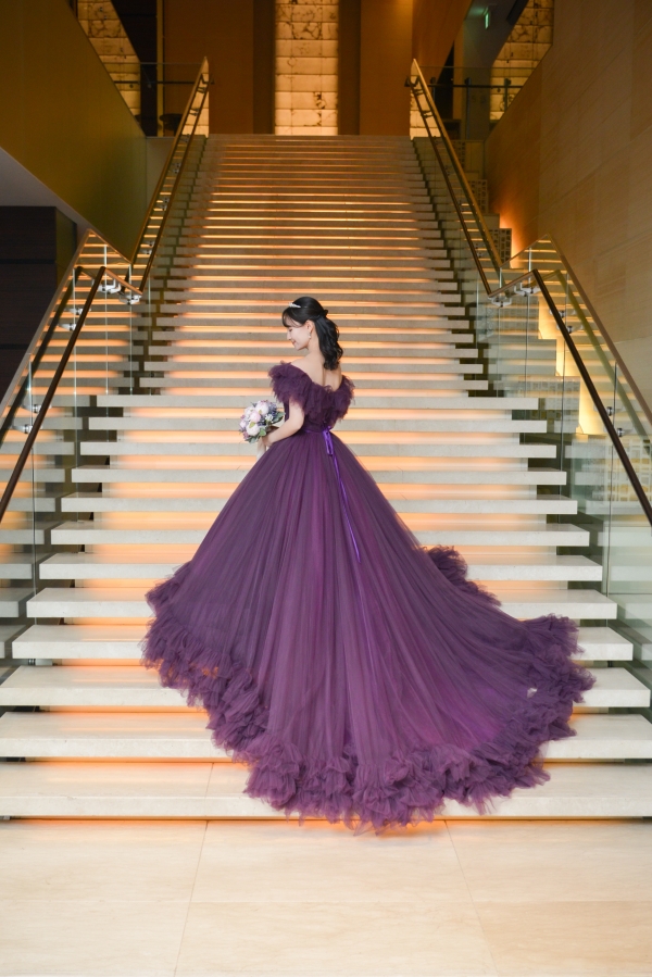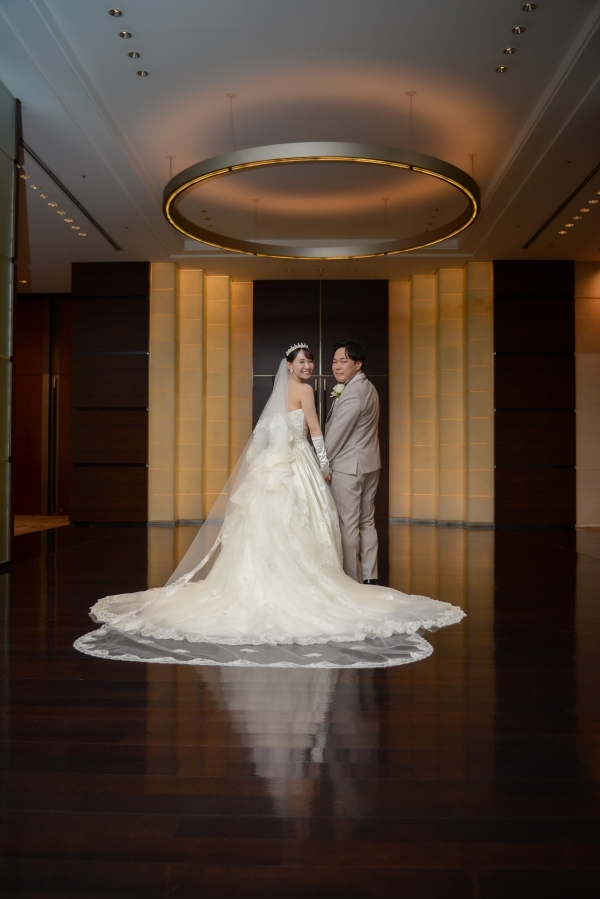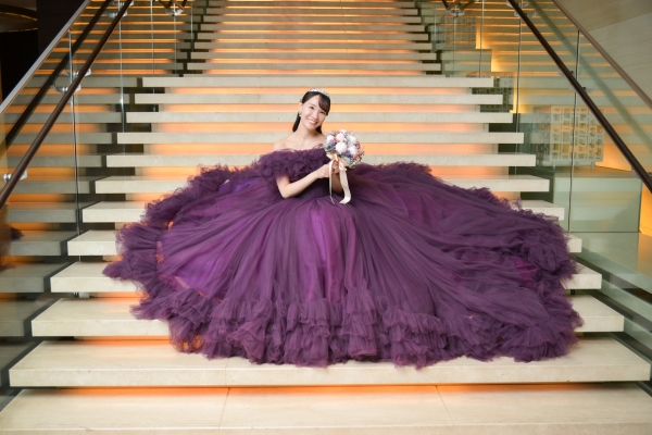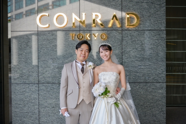 コンラッド東京に映える光沢のあるウェディングドレスとベージュのタキシードを美しく着こなしていただき、印象的なパープルドレススタイルと共にとても素敵で見惚れております。
