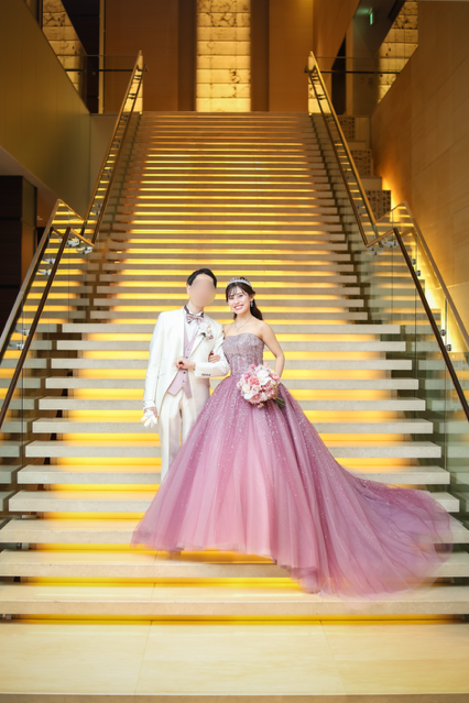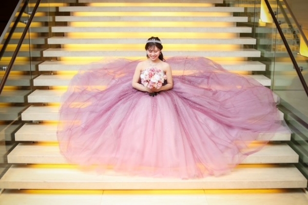 グリッター輝くローズカラーのカクテルドレスを美しく着こなしていただき、