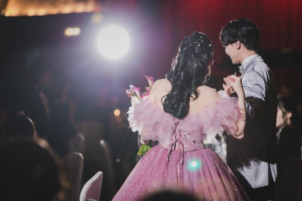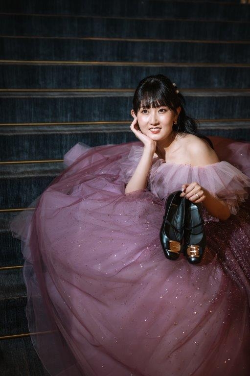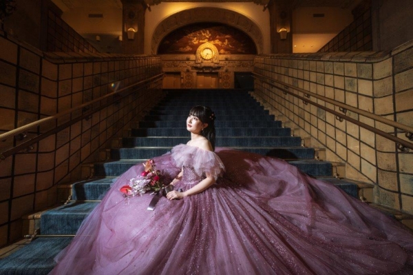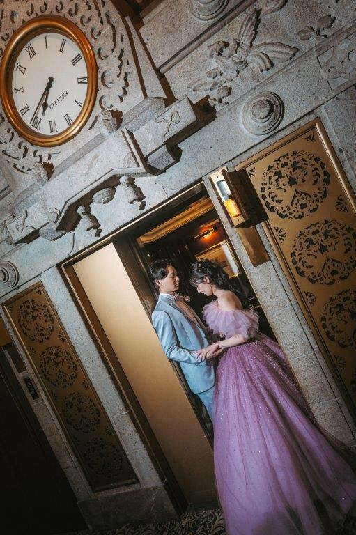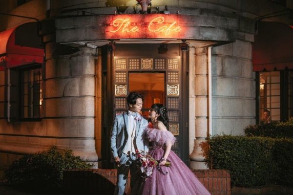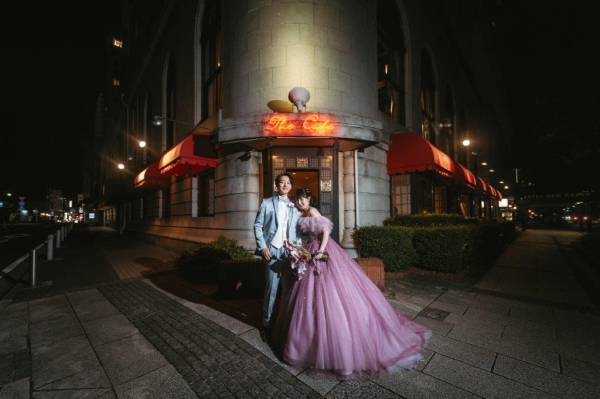 落ち着いた雰囲気を背景にローズグリッターのカラードレスを素敵に着こなしていただいて、スタイリッシュなご新郎様とのお写真とともに見惚れております。