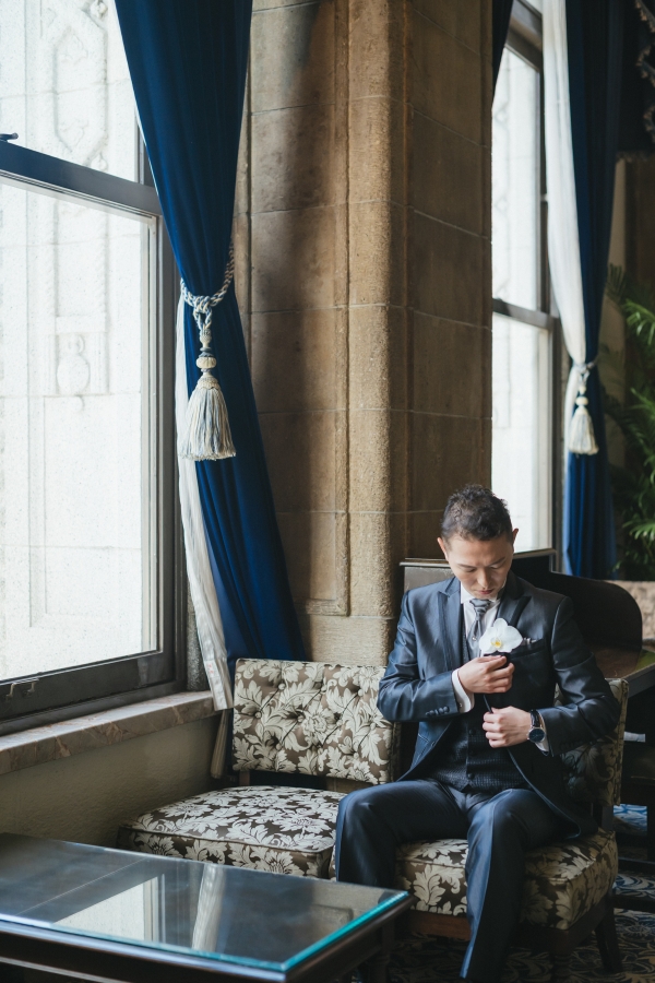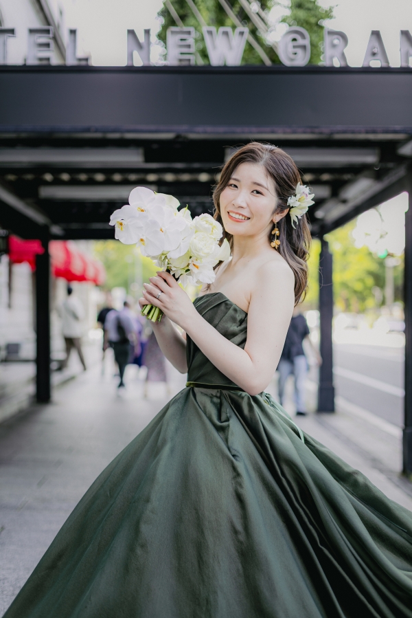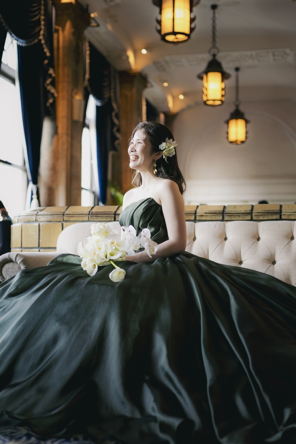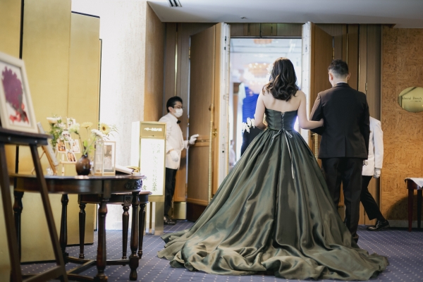 会場の雰囲気に合う深みのあるグリーンドレスとブラウンのタキシードを