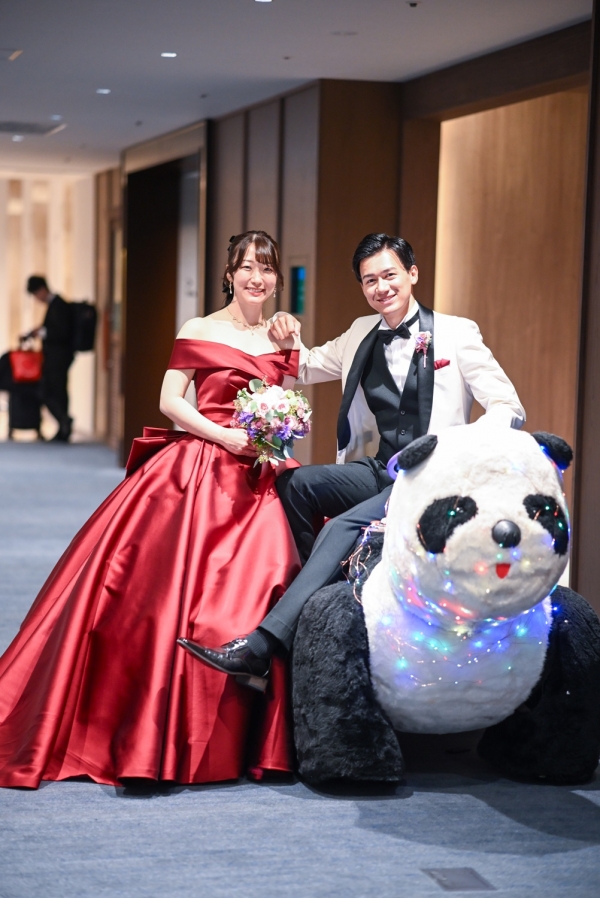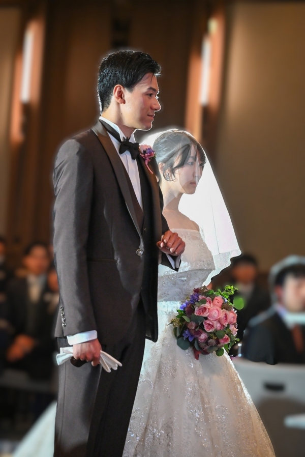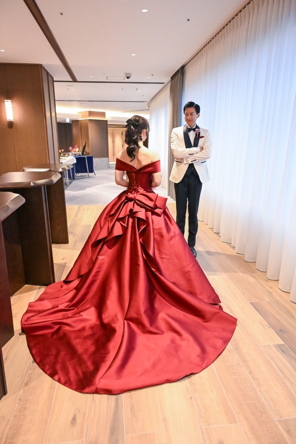 シンプルなバーガンディードレスとホワイトタキシードがとてもお似合い見惚れております。