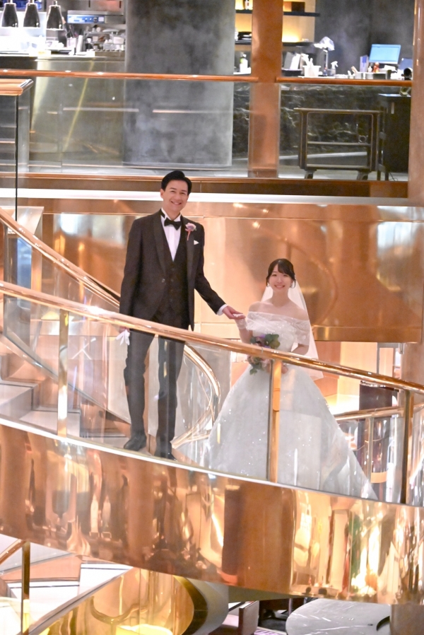 気品あふれるロールカラーのウェディングとダークブラウンのタキシード