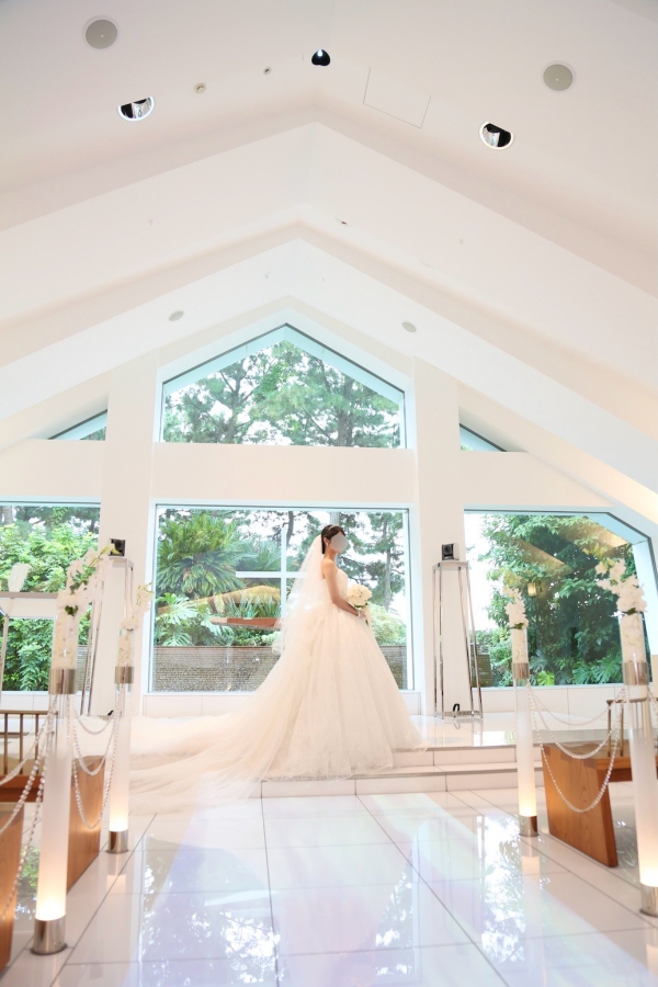 明るいチャペルでのウェディングドレス姿とスタイルを変えたご披露宴での2ショット、エアリーなカラードレススタイル、どのお写真もとてもお似合いで見惚れております。