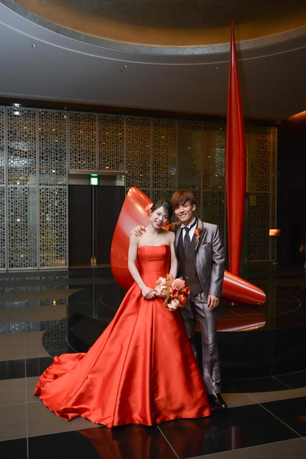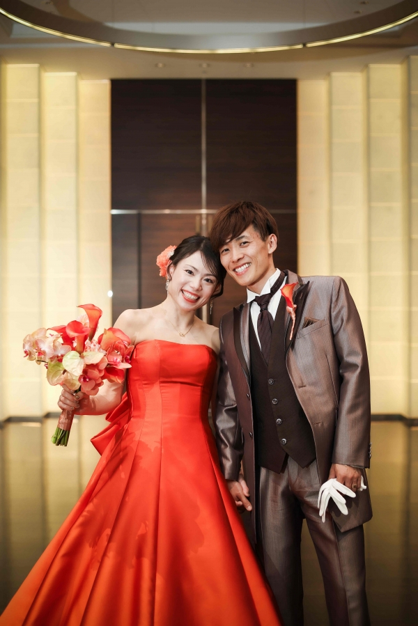 鮮やかなオレンジカラードレスにぴったりのダークブラウンタキシード。